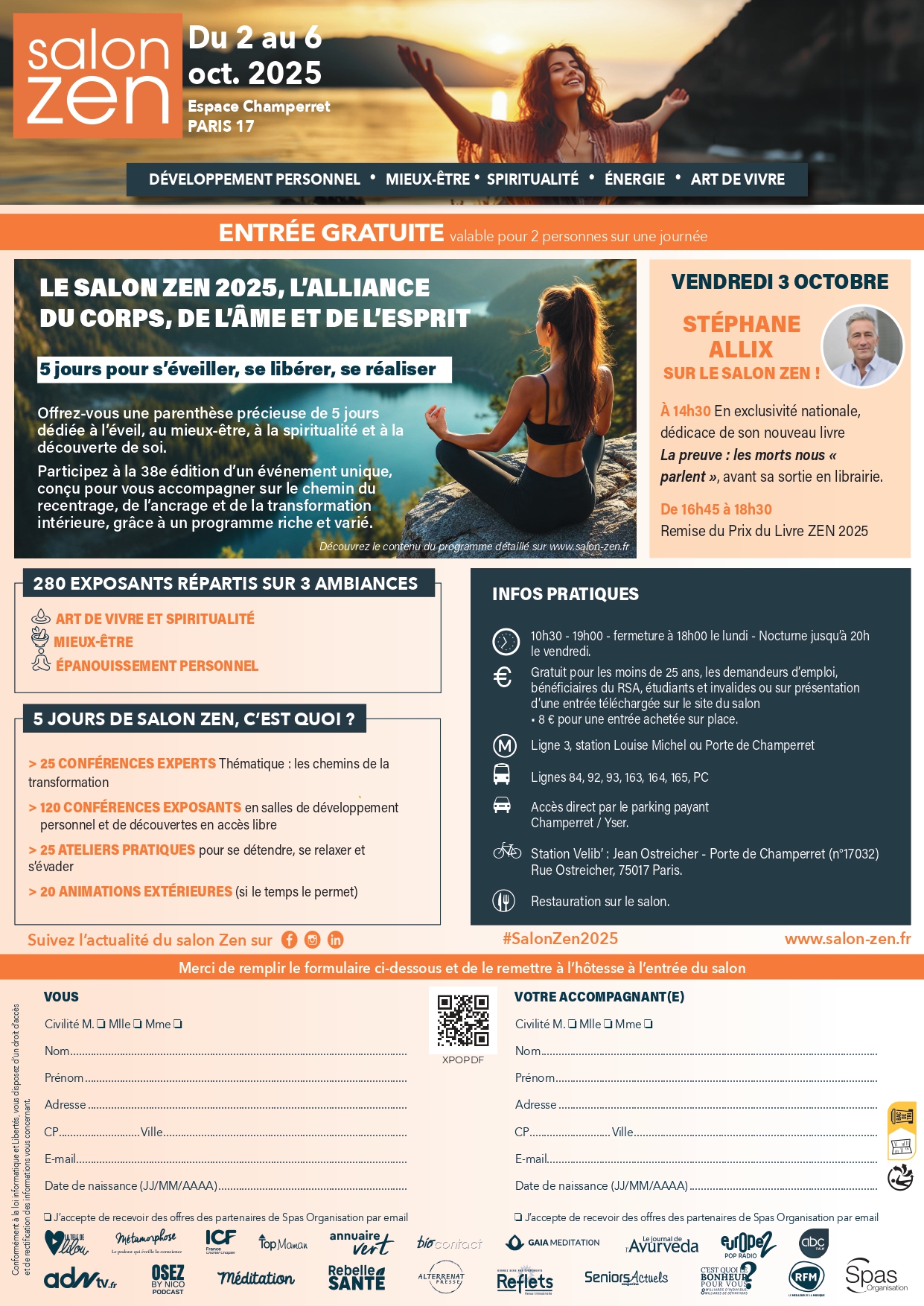 Cher(e)s ami(e)s, cher(e)s client(e)s,J'espère que vous allez tous bien et que la rentrée s'est déroulée au mieux pour vous. Nous avons plusieurs bonnes nouvelles à partager avec vous : Participation au Salon ZenNous serons présents au Salon Zen, qui se tiendra du 2 au 6 octobre 2025 à l'Espace Champerret à Paris. (Imprimer votre invitation) Retrouvez-nous sur le stand D 18 (Voir plan joint pour nous localiser facilement)
